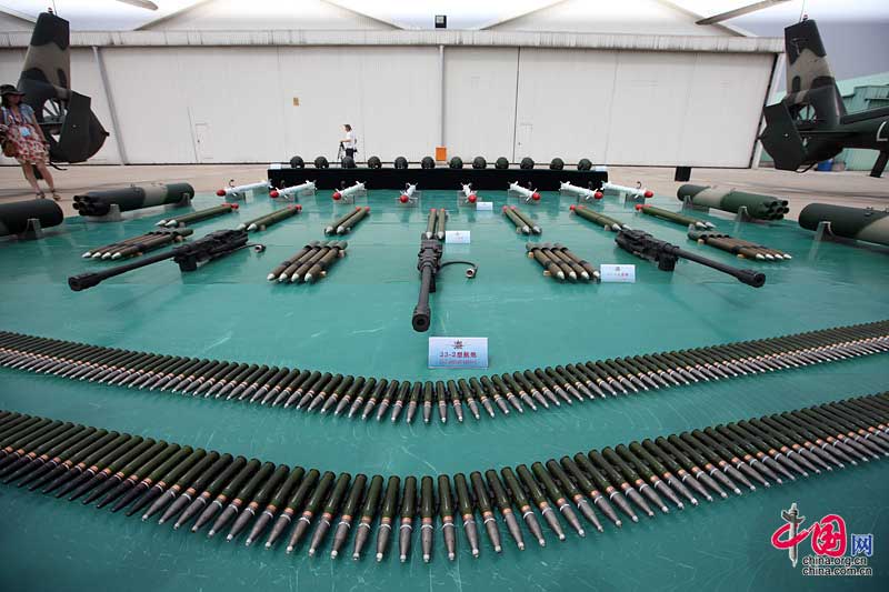 靜態(tài)展示區(qū)展示直9-WZ武裝直升機(jī)的武器裝備和彈藥。 攝影:中國網(wǎng) 楊佳