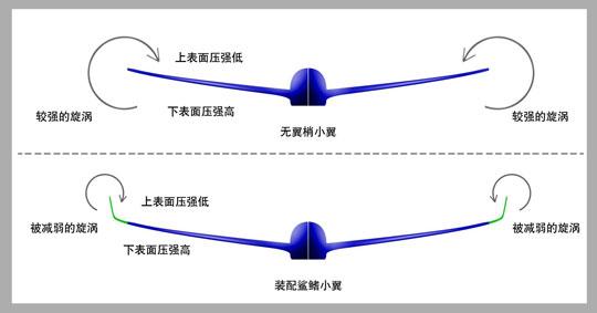 飛機(jī)飛行時(shí),機(jī)翼下表面壓強(qiáng)高,上表面壓強(qiáng)低,因此下表面氣流就會(huì)在翼尖處流向上表面,這樣在翼尖處就不斷形成旋渦,從而產(chǎn)生“誘導(dǎo)阻力”,阻礙飛機(jī)前行。鯊鰭小翼可以部分阻斷機(jī)翼翼尖處的上繞氣流,使旋渦減弱,從而減小阻力,進(jìn)而達(dá)到節(jié)油的效果。
