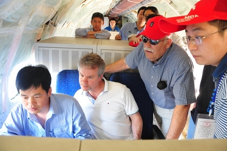 FAA、CAAC審查代表在飛機(jī)機(jī)艙內(nèi)審查試飛相關(guān)數(shù)據(jù)。
