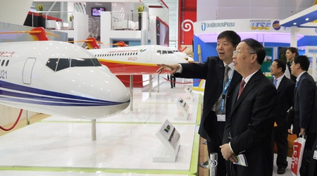 在中國(guó)商飛公司展區(qū),蘇波認(rèn)真察看了C919大型客機(jī)混合級(jí)布局以及ARJ21-700飛機(jī)混合級(jí)、全經(jīng)濟(jì)級(jí)、行政機(jī)和公務(wù)機(jī)布局模型,聽取了公司兩大型號(hào)的最新研制進(jìn)展、能力建設(shè)、人才隊(duì)伍建設(shè)、國(guó)際合作、民機(jī)產(chǎn)業(yè)體系建設(shè)等方面情況的匯報(bào)。蘇波表示,中國(guó)商飛公司成立5年來取得的成績(jī)令人鼓舞,工信部將一如既往地支持中國(guó)商飛公司的發(fā)展建設(shè),希望中國(guó)商飛公司再接再厲、奮力拼搏,爭(zhēng)取早日取得大型客機(jī)項(xiàng)目的成功。