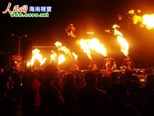 26日晚8點(diǎn)左右,2011環(huán)海南島飛行拉力賽萬(wàn)寧段的首場(chǎng)活動(dòng)——熱氣球噴火表演游行在萬(wàn)寧市區(qū)上演。當(dāng)晚,萬(wàn)寧市區(qū)飄起了毛毛細(xì)雨,20個(gè)熱氣球組成的方陣從萬(wàn)寧市人民中路與萬(wàn)州大道交叉路口出發(fā),以人民公園為終點(diǎn)。在充滿動(dòng)感的音樂(lè)聲中,熱氣球進(jìn)行了多種樣式的噴火表演,交叉噴射,雙向噴射,搖擺噴射……整齊劃一的火柱照亮了萬(wàn)寧的夜空,熾熱耀眼的火焰蒸發(fā)了綿綿的細(xì)雨。眾多萬(wàn)寧市民早早守候在萬(wàn)州大道兩旁,欣賞這難得一見(jiàn)的場(chǎng)景。方陣經(jīng)過(guò)的每個(gè)地方都引起尖叫聲一片,整條街道歡樂(lè)的氣氛達(dá)到了沸點(diǎn)。