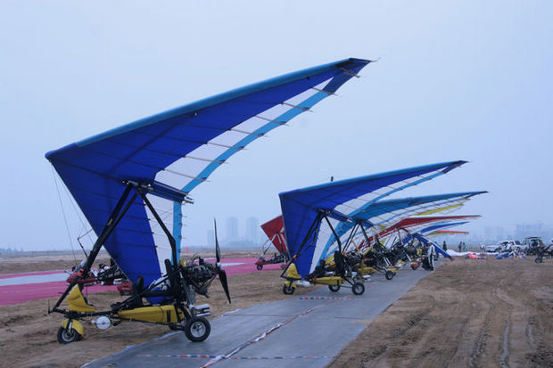 在?谑腥f綠園后觀海臺(tái)賽點(diǎn),動(dòng)力懸掛滑翔機(jī)整裝待發(fā)