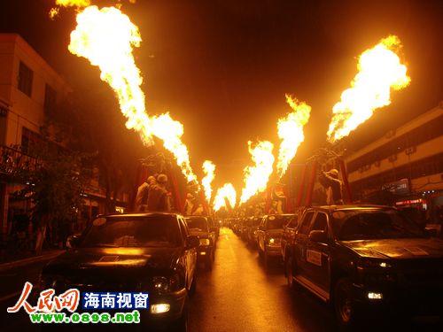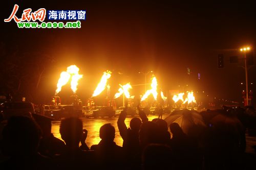 26日晚8點(diǎn)左右,2011環(huán)海南島飛行拉力賽萬(wàn)寧段的首場(chǎng)活動(dòng)——熱氣球噴火表演游行在萬(wàn)寧市區(qū)上演。當(dāng)晚,萬(wàn)寧市區(qū)飄起了毛毛細(xì)雨,20個(gè)熱氣球組成的方陣從萬(wàn)寧市人民中路與萬(wàn)州大道交叉路口出發(fā),以人民公園為終點(diǎn)。在充滿動(dòng)感的音樂(lè)聲中,熱氣球進(jìn)行了多種樣式的噴火表演,交叉噴射,雙向噴射,搖擺噴射……整齊劃一的火柱照亮了萬(wàn)寧的夜空,熾熱耀眼的火焰蒸發(fā)了綿綿的細(xì)雨。眾多萬(wàn)寧市民早早守候在萬(wàn)州大道兩旁,欣賞這難得一見(jiàn)的場(chǎng)景。方陣經(jīng)過(guò)的每個(gè)地方都引起尖叫聲一片,整條街道歡樂(lè)的氣氛達(dá)到了沸點(diǎn)。