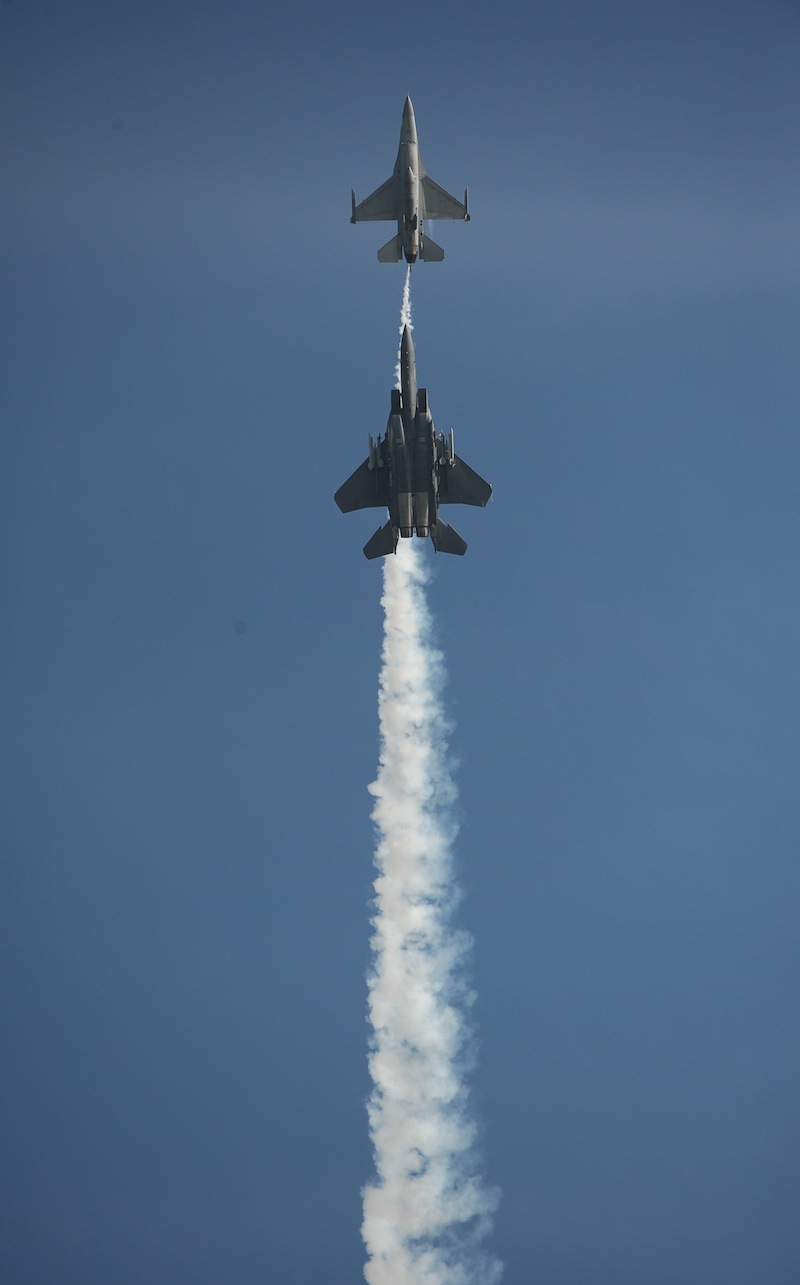 第三屆新加坡航展即將于2月14日正式開(kāi)幕。新加坡空軍F-15SG型多用途戰(zhàn)斗機(jī)與F-16C型戰(zhàn)斗機(jī)緊鑼密鼓地進(jìn)行飛行預(yù)演。