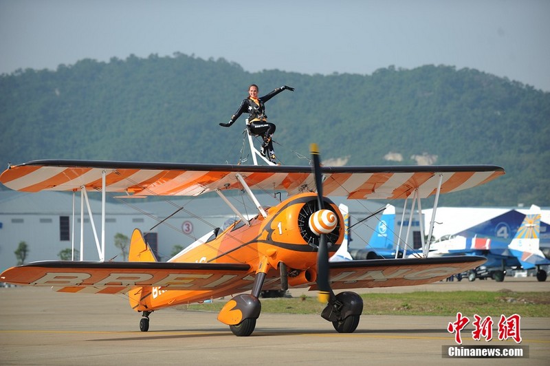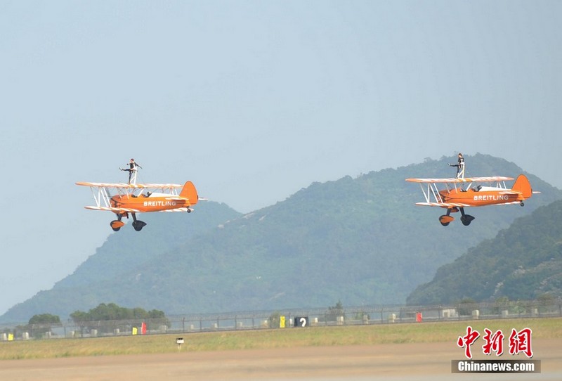 11月11日下午,歐洲“百年靈”機(jī)翼行走飛行表演隊(duì)表演了精彩的“云中漫步”。兩架飛機(jī)上各站有一名美女,在空中表演獨(dú)門舞步和雜技,隨飛機(jī)一起“云中漫步”,優(yōu)雅精準(zhǔn)。