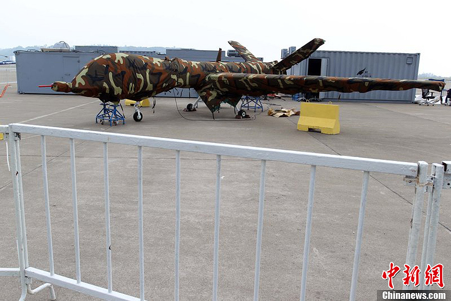 曾在前兩屆珠海航展上展出模型的翼龍無人機(jī),在今年航展上以實(shí)物參展。11月8日,該機(jī)已經(jīng)組裝完畢停放在展坪上。該款無人機(jī)由中航工業(yè)旗下成都飛機(jī)設(shè)計(jì)研究所研制,該機(jī)裝有一臺(tái)100馬力活塞發(fā)動(dòng)機(jī),具備全自主平輪式起降和飛行能力,最大起飛重量達(dá)1100公斤,最大續(xù)航時(shí)間為20個(gè)小時(shí),可攜帶各種偵察、激光照射/測距、電子對抗設(shè)備及小型空地打擊武器,可執(zhí)行監(jiān)視、偵查及對地攻擊任務(wù)等任務(wù),也可用于維穩(wěn)、反恐、邊界巡邏等。
