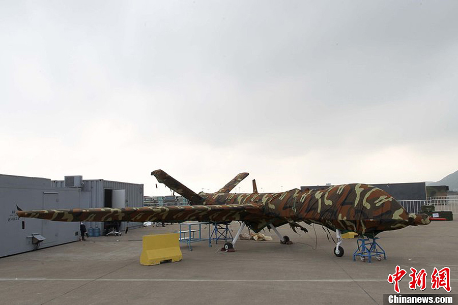 曾在前兩屆珠海航展上展出模型的翼龍無人機(jī),在今年航展上以實(shí)物參展。11月8日,該機(jī)已經(jīng)組裝完畢停放在展坪上。該款無人機(jī)由中航工業(yè)旗下成都飛機(jī)設(shè)計(jì)研究所研制,該機(jī)裝有一臺(tái)100馬力活塞發(fā)動(dòng)機(jī),具備全自主平輪式起降和飛行能力,最大起飛重量達(dá)1100公斤,最大續(xù)航時(shí)間為20個(gè)小時(shí),可攜帶各種偵察、激光照射/測(cè)距、電子對(duì)抗設(shè)備及小型空地打擊武器,可執(zhí)行監(jiān)視、偵查及對(duì)地攻擊任務(wù)等任務(wù),也可用于維穩(wěn)、反恐、邊界巡邏等。