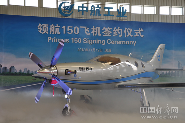 中國經(jīng)濟網(wǎng)珠海航展特派記者團記者段丹峰 劉瑾11月12日報道 12日下午,中航通用飛機有限責(zé)任公司在珠海基地舉行我國首款具有自主知識產(chǎn)權(quán)的全復(fù)合材料輕型公務(wù)機——領(lǐng)航150下線揭幕暨簽約儀式;并在儀式現(xiàn)場喜獲8架用戶訂單。
