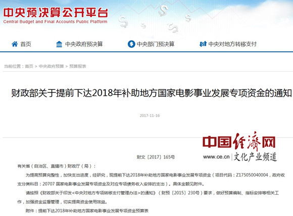 財(cái)政部關(guān)于提前下達(dá)2018年補(bǔ)助地方國家電影事業(yè)發(fā)展專項(xiàng)資金的通知