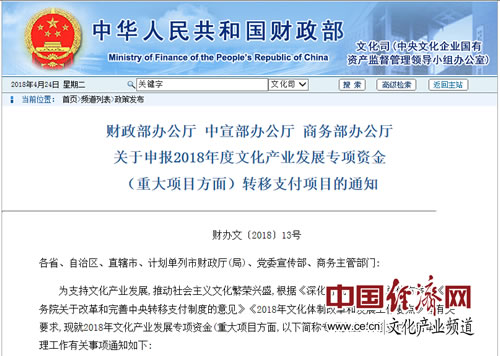 經(jīng)濟(jì)日?qǐng)?bào)-中國經(jīng)濟(jì)網(wǎng)北京4月24日訊  近日,財(cái)政部辦公廳、中宣部辦公廳和商務(wù)部辦公廳聯(lián)合下發(fā)了關(guān)于申報(bào)2018年度文化產(chǎn)業(yè)發(fā)展專項(xiàng)資金(重大項(xiàng)目方面)轉(zhuǎn)移支付項(xiàng)目的通知(以下簡(jiǎn)稱“通知”)。根據(jù)通知,專項(xiàng)資金將直接補(bǔ)助推動(dòng)影視產(chǎn)業(yè)發(fā)展和對(duì)外文化貿(mào)易發(fā)展的重大項(xiàng)目。