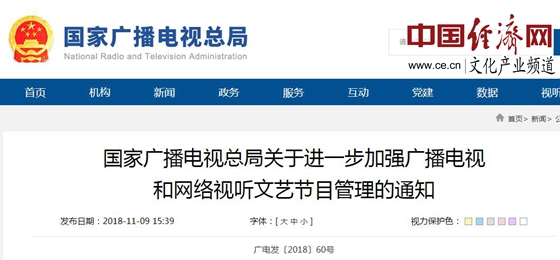 經(jīng)濟(jì)日?qǐng)?bào)-中國經(jīng)濟(jì)網(wǎng)北京11月20日訊 日前,國家廣播電視總局發(fā)布了《關(guān)于進(jìn)一步加強(qiáng)廣播電視和網(wǎng)絡(luò)視聽文藝節(jié)目管理的通知》(以下簡稱“通知”)。《通知》指出,一些文藝節(jié)目出現(xiàn)了影視明星過多、追星炒星、泛娛樂化、高價(jià)片酬、收視率(點(diǎn)擊率)造假等問題,不僅推高制作成本、破壞行業(yè)秩序生態(tài),而且誤導(dǎo)青少年盲目追星,滋長拜金主義、一夜成名等錯(cuò)誤價(jià)值觀念,必須采取有效措施切實(shí)加以糾正。
