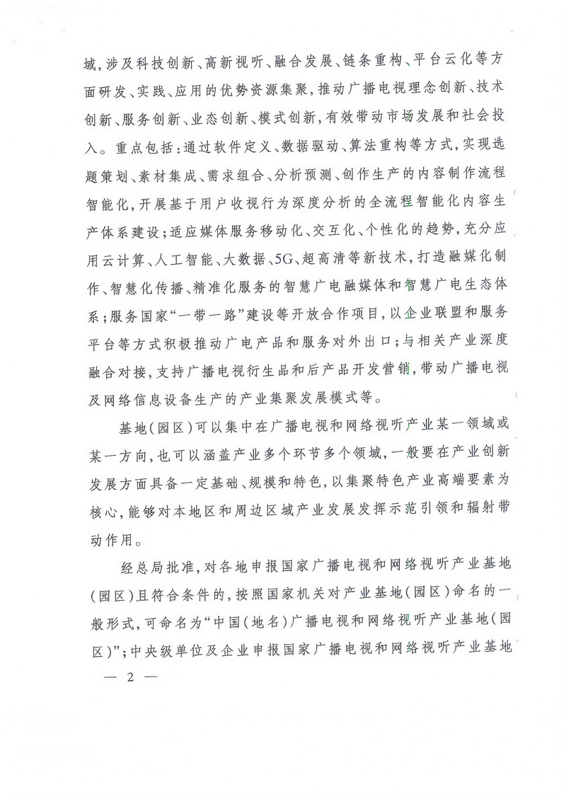 國(guó)家廣播電視和網(wǎng)絡(luò)視聽產(chǎn)業(yè)基地(園區(qū))由國(guó)家廣播電視總局(以下簡(jiǎn)稱“總局”)命名,主要體現(xiàn)在廣播電視和網(wǎng)絡(luò)視聽內(nèi)容制作、分發(fā)傳播、用戶服務(wù)、技術(shù)支撐、生態(tài)建設(shè)以及運(yùn)營(yíng)管理等領(lǐng)域,涉及科技創(chuàng)新、高新視聽、融合發(fā)展、鏈條重構(gòu)、平臺(tái)云化等方面研發(fā)、實(shí)踐、應(yīng)用的優(yōu)勢(shì)資源集聚,推動(dòng)廣播電視理念創(chuàng)新、技術(shù)創(chuàng)新、服務(wù)創(chuàng)新、業(yè)態(tài)創(chuàng)新、模式創(chuàng)新,有效帶動(dòng)市場(chǎng)發(fā)展和社會(huì)投入。重點(diǎn)包括:通過軟件定義、數(shù)據(jù)驅(qū)動(dòng)、算法重構(gòu)等方式,實(shí)現(xiàn)選題策劃、素材集成、需求組合、分析預(yù)測(cè)、創(chuàng)作生產(chǎn)的內(nèi)容制作流程智能化,開展基于用戶收視行為深度分析的全流程智能化內(nèi)容生產(chǎn)體系建設(shè);適應(yīng)媒體服務(wù)移動(dòng)化、交互化、個(gè)性化的趨勢(shì),充分應(yīng)用云計(jì)算、人工智能、大數(shù)據(jù)、5G、超高清等新技術(shù),打造融媒化制作、智慧化傳播、精準(zhǔn)化服務(wù)的智慧廣電融媒體和智慧廣電生態(tài)體系;服務(wù)國(guó)家“一帶一路”建設(shè)等開放合作項(xiàng)目,以企業(yè)聯(lián)盟和服務(wù)平臺(tái)等方式積極推動(dòng)廣電產(chǎn)品和服務(wù)對(duì)外出口;與相關(guān)產(chǎn)業(yè)深度融合對(duì)接,支持廣播電視衍生品和后產(chǎn)品開發(fā)營(yíng)銷,帶動(dòng)廣播電視及網(wǎng)絡(luò)信息設(shè)備生產(chǎn)的產(chǎn)業(yè)集聚發(fā)展模式等。
