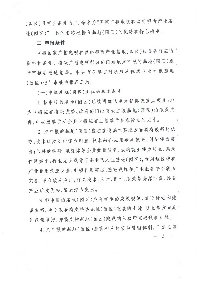 為推進(jìn)全國(guó)廣播電視和網(wǎng)絡(luò)視聽產(chǎn)業(yè)高質(zhì)量發(fā)展,推動(dòng)和規(guī)范廣播電視和網(wǎng)絡(luò)視聽產(chǎn)業(yè)基地(園區(qū))充分發(fā)揮示范先導(dǎo)作用,增強(qiáng)集聚和規(guī)模效應(yīng),促進(jìn)產(chǎn)業(yè)做大做優(yōu)做強(qiáng),現(xiàn)就推動(dòng)國(guó)家廣播電視和網(wǎng)絡(luò)視聽產(chǎn)業(yè)基地(園區(qū))建設(shè)和發(fā)展有關(guān)工作通知如下。