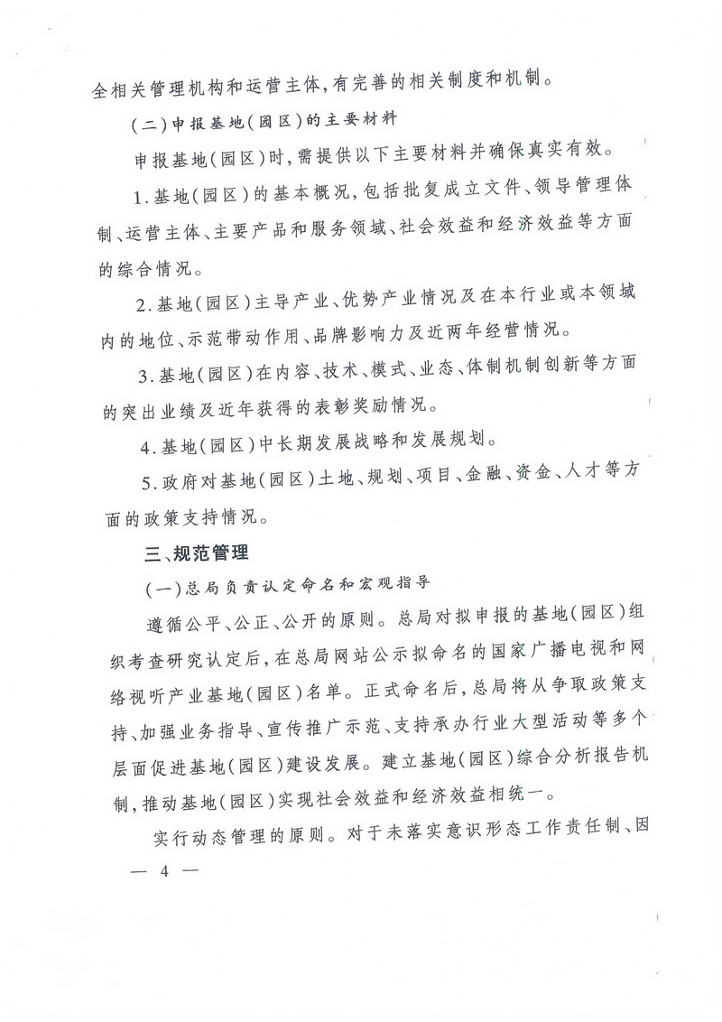 對(duì)總局此前已經(jīng)命名的基地(園區(qū)),屬于廣播電視和網(wǎng)絡(luò)視聽方面的,要進(jìn)行全面梳理,按本通知精神納入統(tǒng)籌管理,推動(dòng)轉(zhuǎn)型升級(jí),并按上述時(shí)間要求報(bào)送年度發(fā)展情況報(bào)告。