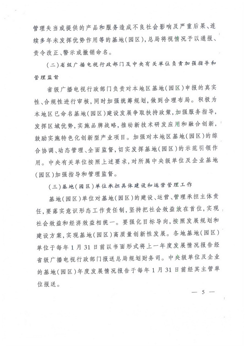 基地(園區(qū))單位對(duì)基地(園區(qū))的建設(shè)、運(yùn)營(yíng)、管理承擔(dān)主體責(zé)任,要落實(shí)意識(shí)形態(tài)工作責(zé)任制,堅(jiān)持把社會(huì)效益放在首位,實(shí)現(xiàn)社會(huì)效益和經(jīng)濟(jì)效益相統(tǒng)一。要強(qiáng)化目標(biāo)導(dǎo)向,按照發(fā)展規(guī)劃和建設(shè)方案,實(shí)現(xiàn)基地(園區(qū))高質(zhì)量創(chuàng)新性發(fā)展。各地基地(園區(qū))單位于每年1月31日前以書面形式將上一年度發(fā)展情況報(bào)告經(jīng)省級(jí)廣播電視行政部門報(bào)送總局規(guī)劃財(cái)務(wù)司。中央級(jí)單位及企業(yè)的基地(園區(qū))年度發(fā)展情況報(bào)告于每年1月31日前經(jīng)其主管單位報(bào)送。