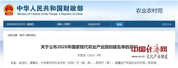 經濟日報-中國經濟網北京5月7日訊 5月6日,農業(yè)農村部、財政部公布2020年國家現代農業(yè)產業(yè)園創(chuàng)建名單。經遴選,批準北京市平谷區(qū)等31個現代農業(yè)產業(yè)園創(chuàng)建國家現代農業(yè)產業(yè)園;江蘇省蘇州市吳江區(qū)等8個省級現代農業(yè)產業(yè)園納入國家現代農業(yè)產業(yè)園創(chuàng)建管理體系。