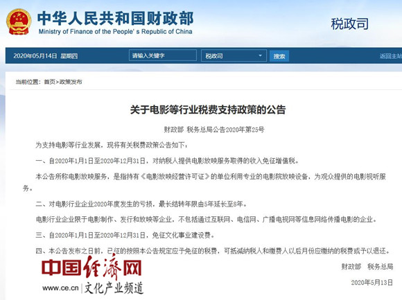 經(jīng)濟日報-中國經(jīng)濟網(wǎng)北京5月14日訊 2020年5月13日,財政部、稅務(wù)總局發(fā)布《關(guān)于電影等行業(yè)稅費支持政策的公告》。據(jù)經(jīng)濟日報-中國經(jīng)濟網(wǎng)文化產(chǎn)業(yè)頻道(微信號:cewenhua)了解,自2020年1月1日至2020年12月31日,對納稅人提供電影放映服務(wù)取得的收入免征增值稅。對電影行業(yè)企業(yè)2020年度發(fā)生的虧損,最長結(jié)轉(zhuǎn)年限由5年延長至8年。自2020年1月1日至2020年12月31日,免征文化事業(yè)建設(shè)費。