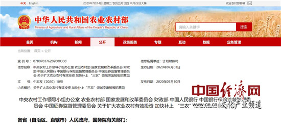 經(jīng)濟日報-中國經(jīng)濟網(wǎng)北京7月14日訊 近日,中央農(nóng)辦、農(nóng)業(yè)農(nóng)村部、發(fā)展改革委、財政部、人民銀行、銀保監(jiān)會、證監(jiān)會等7部門聯(lián)合印發(fā)《關于擴大農(nóng)業(yè)農(nóng)村有效投資 加快補上“三農(nóng)”領域突出短板的意見》(以下簡稱《意見》),部署擴大農(nóng)業(yè)農(nóng)村有效投資,為打贏脫貧攻堅戰(zhàn)和全面建成小康社會提供堅實支撐。