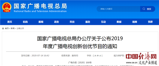 經(jīng)濟日報-中國經(jīng)濟網(wǎng)北京7月15日訊 7月14日,國家廣播電視總局公布了2019年度廣播電視創(chuàng)新創(chuàng)優(yōu)節(jié)目。
