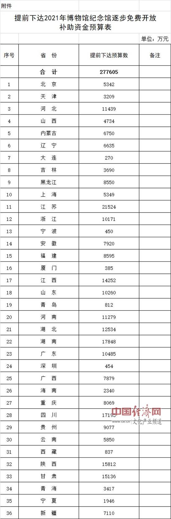 以下為提前下達2021年博物館紀念館逐步免費開放補助資金預算表: