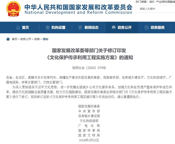 中國經濟網北京4月8日訊(記者 成琪)據國家發(fā)改委網站4月7日消息,為進一步完善全國城鄉(xiāng)公共文化服務體系,加強文化和自然遺產整體保護和活態(tài)傳承,推動文化旅游融合高質量發(fā)展,助力文化強國建設,國家發(fā)展改革委會同相關部門對《文化保護傳承利用工程實施方案》(以下簡稱“《方案》”)進行了修訂?!斗桨浮访鞔_,要依托國家級資源新建或改擴建一批重大文化設施,提升公共文化服務水平,促進優(yōu)秀傳統(tǒng)文化和寶貴自然遺產整體保護和活態(tài)傳承,推動高質量發(fā)展和創(chuàng)造高品質生活相得益彰。