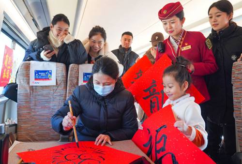 津興城際G8844次列車上,旅客現(xiàn)場手寫書法福字、畫龍頭。(中國鐵路北京局集團(tuán)有限公司供圖)