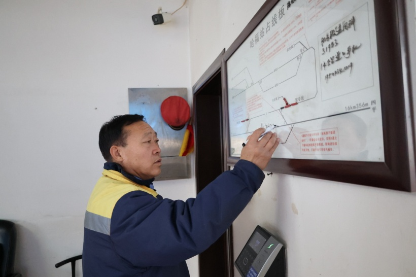 9時10分,正在站長室認(rèn)真填寫《站務(wù)日志》的副站長汪曉利,接到車站值班員“43078次列車開過來了,站序防護(hù)”的電話通知,他摘下老花鏡,起身穿上棉大衣,戴好帽子,出門向400米外的站序防護(hù)地點(diǎn)走去?!靶≌镜母刹烤鸵恰f金油’,哪個崗位缺人,我們老哥倆都要頂上。夏季每天站序防護(hù)需要往返20多次,即使冬季能少點(diǎn),也要10幾次?!迸D月的寒風(fēng)中,汪曉利一邊走一邊說。
