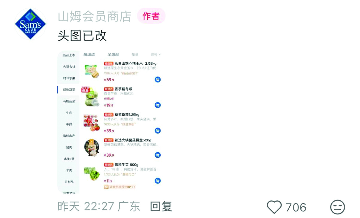 “本次APP的改動于今年8月底開始上線進(jìn)行測試,并在期間持續(xù)根據(jù)會員的反饋進(jìn)行優(yōu)化。這兩天我們陸續(xù)收到了更多來自會員關(guān)于商品圖片等方面的寶貴建議,我們將會持續(xù)改進(jìn),以更好地展現(xiàn)商品的真實形態(tài)并提升體驗。我們始終珍視會員的聲音,歡迎大家在‘山姆APP—我的—用戶調(diào)研—商品詳情頁調(diào)研’持續(xù)給予反饋。感謝大家的支持?!背酥猓侥愤€在評論區(qū)配圖稱:“頭圖已改。”