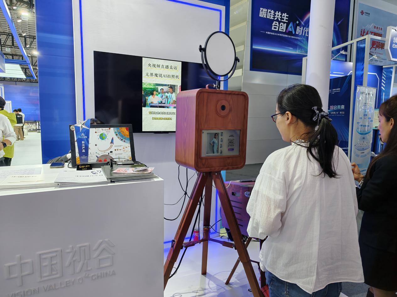 觀眾體驗(yàn)中國(guó)視谷的無(wú)界魔鏡AI拍照機(jī),其內(nèi)置數(shù)百款風(fēng)格迥異的寫真模板,依托AI視覺(jué)大模型,具備強(qiáng)大的影像生成能力。中國(guó)經(jīng)濟(jì)網(wǎng)記者李方/攝