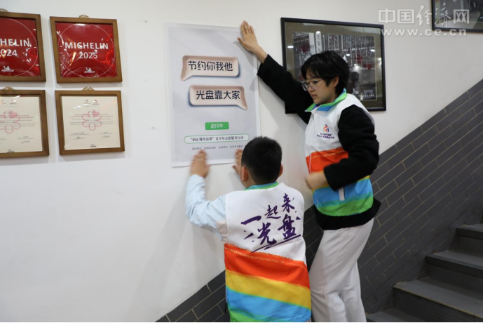 活動中,“制止餐飲浪費”青少年志愿者們首先將宣傳節(jié)約糧食、反對浪費的標語海報張貼在餐廳顯著位置。