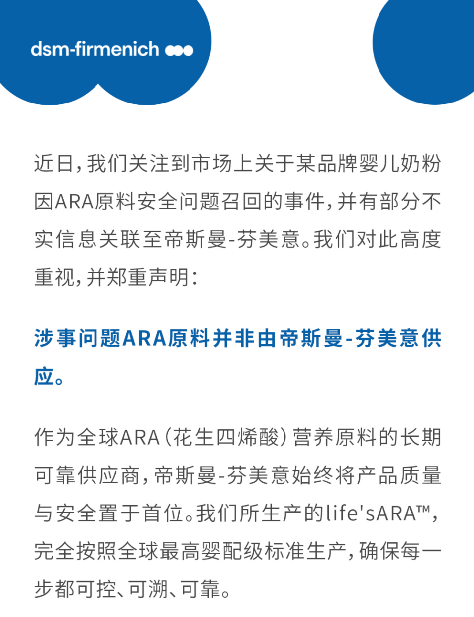 帝斯曼-芬美意人類營養(yǎng)與關(guān)愛事業(yè)部的官方公眾號“帝斯曼芬美意營養(yǎng)365”發(fā)布聲明《嚴(yán)正聲明:近日涉事問題ARA原料并非由帝斯曼-芬美意供應(yīng)》的截圖。