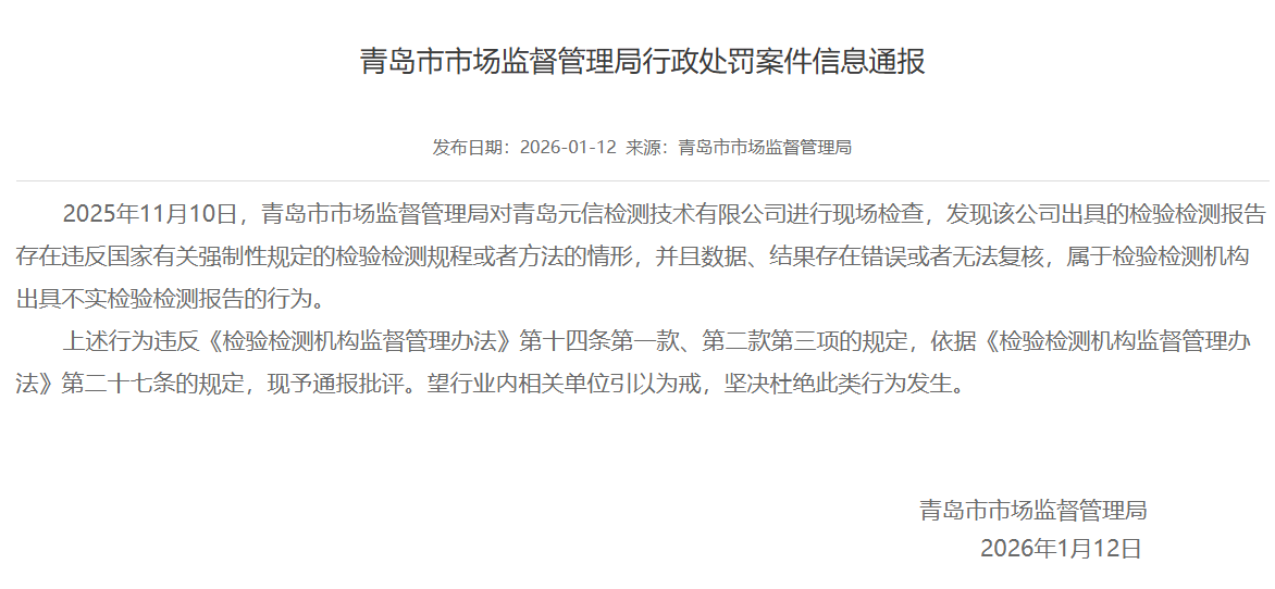 這場(chǎng)圍繞雞蛋角黃素的爭(zhēng)議,最早在今年“3?15”前后引發(fā)廣泛關(guān)注。某打假人連續(xù)發(fā)布檢測(cè)報(bào)告,稱在商超渠道購(gòu)買的多款雞蛋中檢出角黃素,并點(diǎn)名黃天鵝等品牌,正式拉開事件序幕。隨著官方抽檢結(jié)果公布,個(gè)人送檢“檢出角黃素”與官方抽檢“未檢出角黃素”兩種結(jié)論并存,相關(guān)討論也從食品安全本身,進(jìn)一步延伸至檢測(cè)報(bào)告的公信力之爭(zhēng)。其中,為某打假人提供檢測(cè)報(bào)告的檢測(cè)機(jī)構(gòu)合規(guī)性備受質(zhì)疑:據(jù)青島市市場(chǎng)監(jiān)管局公開信息,青島元信檢測(cè)技術(shù)有限公司因“出具不實(shí)檢驗(yàn)檢測(cè)報(bào)告”“數(shù)據(jù)無法復(fù)核”等問題,已于2026年1月12日被行政處罰。