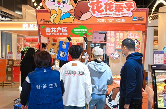 在哈一口氣便能凝結(jié)出霧的寒冬,暖呼呼的糖炒栗子最能溫暖人心。在午后的盒馬線下門店,糖炒栗子的檔口已經(jīng)排起了長(zhǎng)隊(duì),工作人員將剛炒制出來(lái)的新鮮栗子裝進(jìn)了印有迪士尼人物奇奇蒂蒂形象的紙盒里,遞給消費(fèi)者?!疤鹛鹋磁吹睦踝?,最適合當(dāng)冬天小零食”、“沖著這個(gè)包裝來(lái)買的,太可愛(ài)了?!?/p>