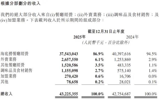 值得注意的是,海底撈的核心板塊餐廳經(jīng)營(yíng)業(yè)務(wù)出現(xiàn)增長(zhǎng)瓶頸。財(cái)報(bào)顯示,海底撈餐廳經(jīng)營(yíng)收入從2024年的403.98億元降至375.43億元,同比減少7.1%,占總營(yíng)收比重也從94.5%收縮至86.9%。