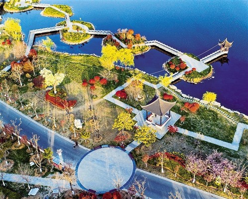 4月7日拍攝的江蘇省連云港市東??h水晶公園。近年來,東??h堅持走“生態(tài)優(yōu)先、綠色發(fā)展”之路,通過實施生態(tài)修復(fù),河道、村莊綜合整治等多項管理機(jī)制,為當(dāng)?shù)卮蛟炝恕氨趟{(lán)天、岸綠花香”的良好生態(tài)。
