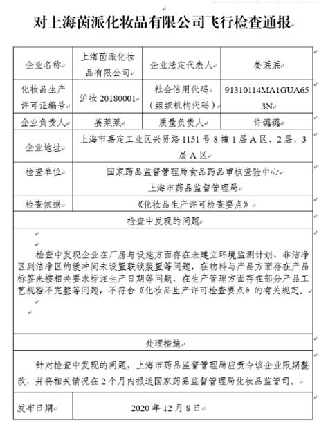 飛行檢查報(bào)告顯示,在檢查中發(fā)現(xiàn)上海茵派化妝品有限公司在廠房與設(shè)施方面存在未建立環(huán)境監(jiān)測(cè)計(jì)劃、非潔凈區(qū)到潔凈區(qū)的緩沖間未設(shè)置聯(lián)鎖裝置等問(wèn)題,在物料與產(chǎn)品方面存在產(chǎn)品標(biāo)簽未按相關(guān)要求標(biāo)注生產(chǎn)日期等問(wèn)題,在生產(chǎn)管理方面存在部分產(chǎn)品工藝規(guī)程不完整等問(wèn)題。