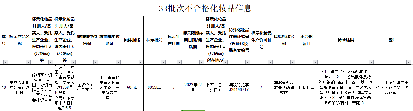 通告顯示,經(jīng)湖北省藥品監(jiān)督檢驗(yàn)研究院檢測(cè),經(jīng)銷商為資生堂(中國(guó))投資有限公司,生產(chǎn)商為株式會(huì)社資生堂銷售的產(chǎn)品安熱沙水能戶外清透防曬乳產(chǎn)品不合格,檢驗(yàn)結(jié)果為未檢出批件及標(biāo)簽標(biāo)識(shí)的防曬劑:雙-乙基己氧苯酚甲氧苯基三嗪、二乙氨羥苯甲?;郊姿峒乎ズ蛫W克立林;檢出批件及標(biāo)簽未標(biāo)識(shí)的防曬劑二苯酮-3。