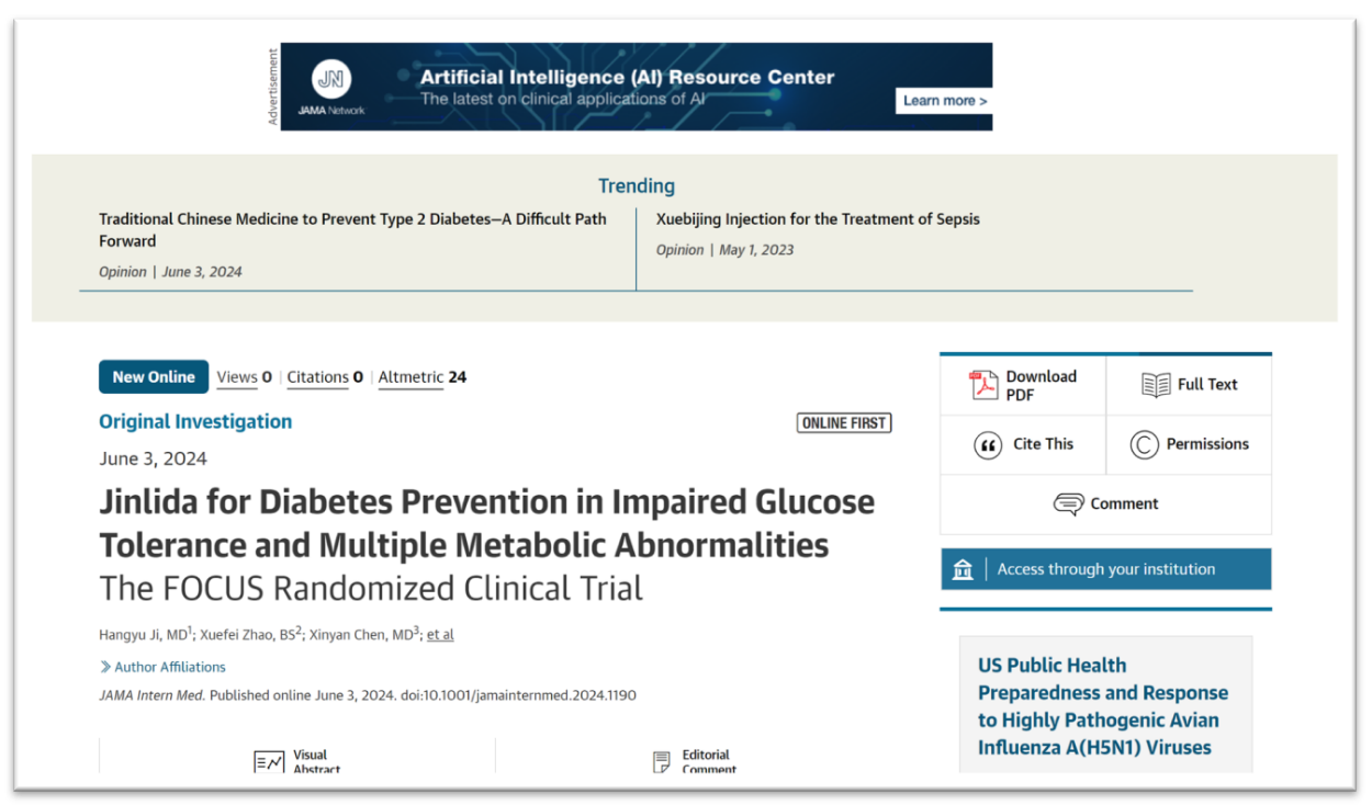 美國當(dāng)?shù)貢r間2024年6月3日,以嶺藥業(yè)生產(chǎn)的創(chuàng)新中藥津力達(dá)顆粒循證研究論文《津力達(dá)對糖耐量異常合并多代謝紊亂人群的糖尿病預(yù)防效果——FOCUS隨機(jī)臨床試驗》在國際權(quán)威醫(yī)學(xué)期刊《美國醫(yī)學(xué)會雜志·內(nèi)科學(xué)》(JAMA Internal Medicine,影響因子39)發(fā)表。論文介紹了津力達(dá)干預(yù)代謝綜合征糖耐量異常人群取得的重大成果——津力達(dá)可降低糖耐量異常合并多代謝紊亂人群罹患糖尿病的風(fēng)險,為糖尿病的預(yù)防提供了新的視角和策略。