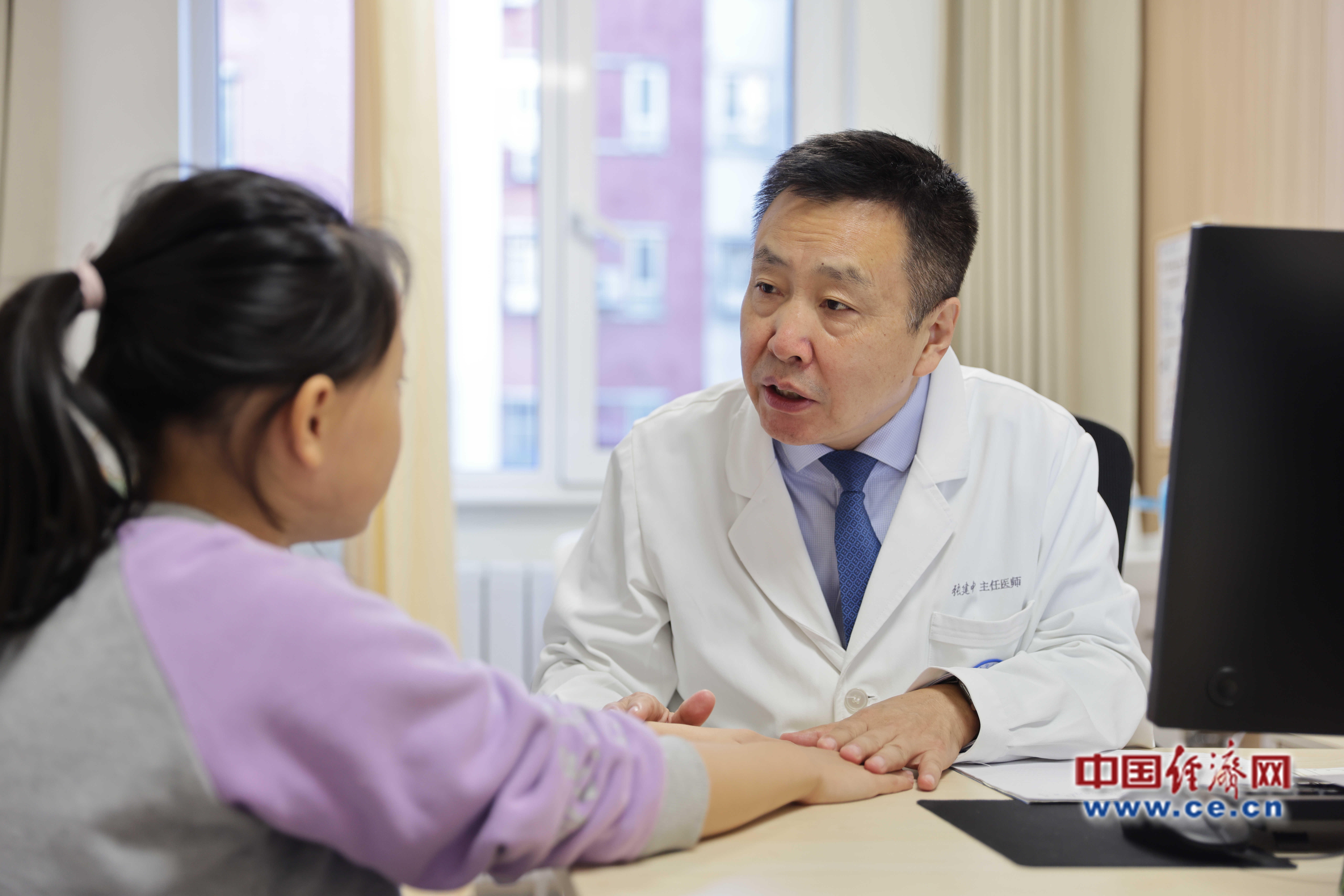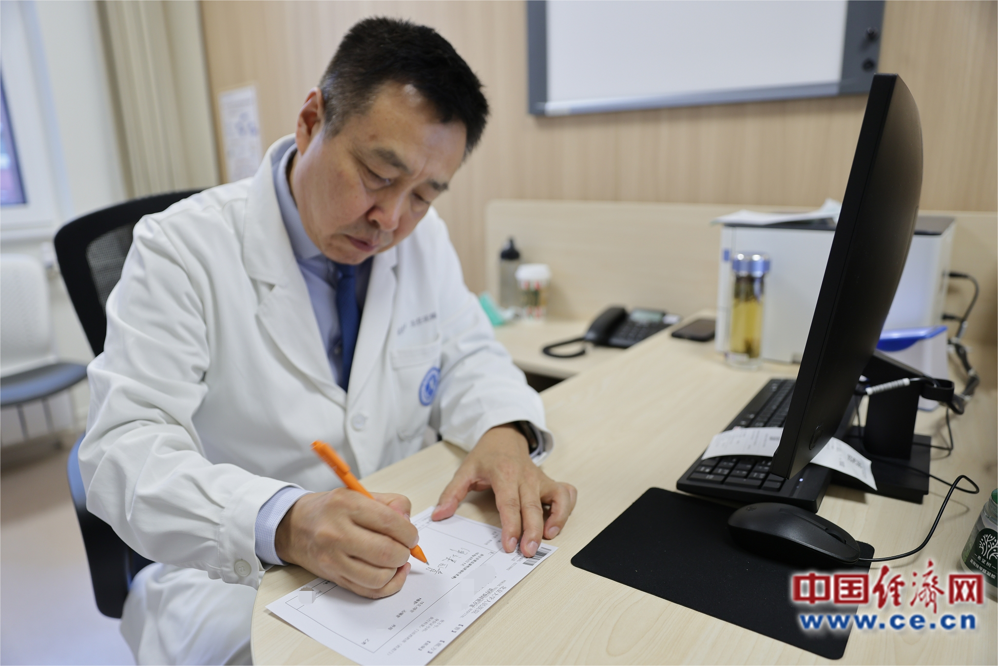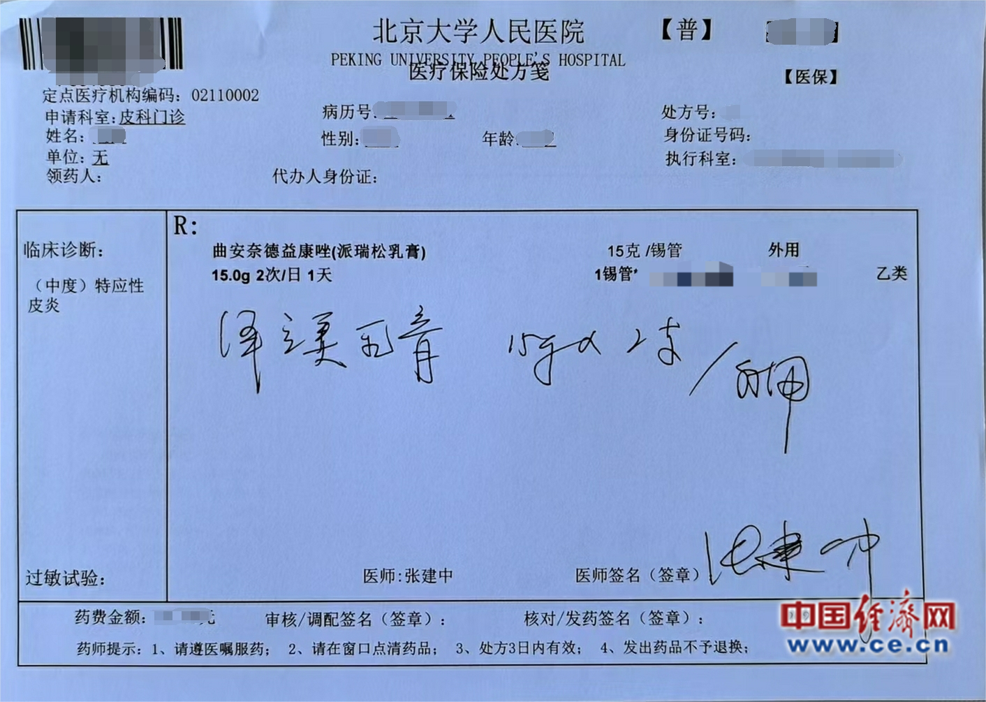 圖為北京大學人民醫(yī)院皮膚科張建中教授為患者開出首張?zhí)幏?中國經(jīng)濟網(wǎng)裴小閣攝