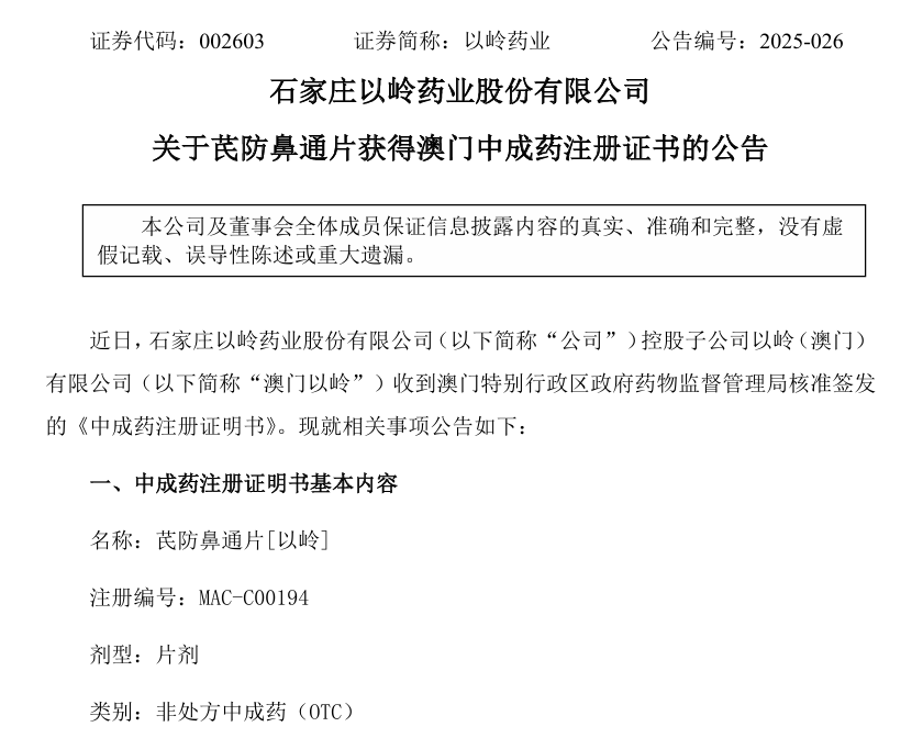 7月11日晚,以嶺藥業(yè)發(fā)布公告稱,該公司控股子公司以嶺(澳門)有限公司收到澳門特別行政區(qū)政府藥物監(jiān)督管理局(以下簡(jiǎn)稱“澳門藥監(jiān)局”)核準(zhǔn)簽發(fā)的《中成藥注冊(cè)證明書》。