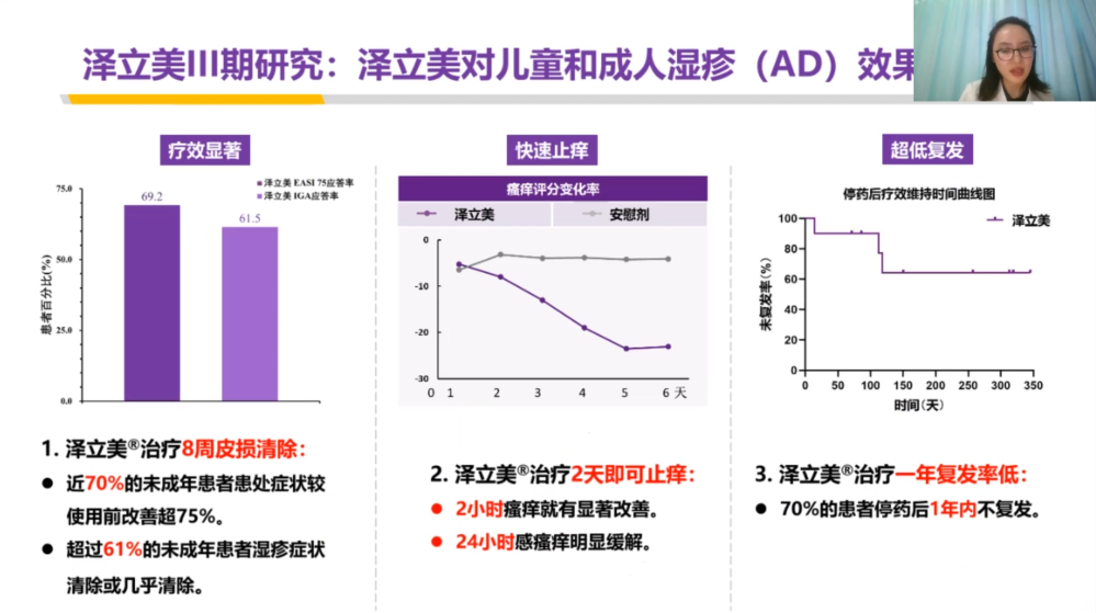 趙琰教授還分享了澤立美重要臨床數(shù)據(jù):"在為期8周的III期臨床試驗(yàn)中,澤立美組61.5%的患者實(shí)現(xiàn)皮損完全清除,瘙癢改善最快僅需2小時(shí)。更可喜的是,停藥1年后仍有70%患者維持緩解狀態(tài)。"相比美國(guó)市場(chǎng)1400美元/支的售價(jià),該藥國(guó)內(nèi)定價(jià)僅360元,大大減輕患者經(jīng)濟(jì)負(fù)擔(dān)。