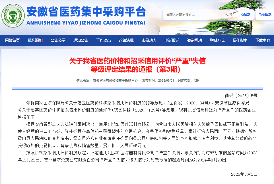 通報(bào)顯示,根據(jù)安徽省黟縣人民法院刑事判決書,通用(上海)醫(yī)療器材有限公司向黃山市人民醫(yī)院相關(guān)人員給予回扣或不正當(dāng)利益,以使其經(jīng)營(yíng)的進(jìn)口創(chuàng)傷類、脊柱類骨科高值耗材獲得額外的交易機(jī)會(huì)、競(jìng)爭(zhēng)優(yōu)勢(shì)和銷售數(shù)量,累計(jì)折合人民幣54萬(wàn)元;按照價(jià)格招采信用評(píng)價(jià)制度規(guī)定,評(píng)定通用(上海)醫(yī)療器材有限公司“嚴(yán)重”失信,該失信行為時(shí)效標(biāo)準(zhǔn)的起始時(shí)間為2023年12月22日。