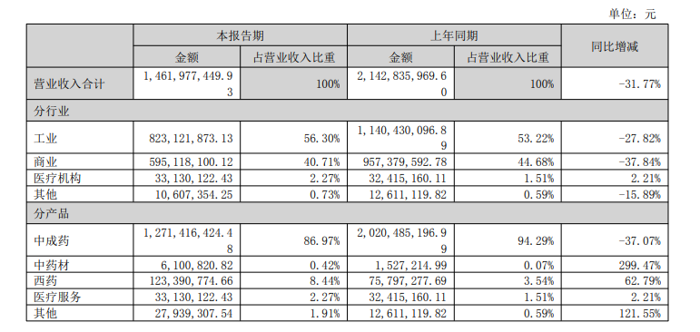 根據(jù)半年報,醫(yī)藥工業(yè)仍是貴州百靈業(yè)績重要支撐,貢獻逾一半營收。具體來看,工業(yè)實現(xiàn)營收8.23億元,同比下降27.82%;商業(yè)實現(xiàn)營收5.95億元,同比下降37.84%;醫(yī)療機構(gòu)實現(xiàn)營收0.33億元,同比增長2.21%;其他實現(xiàn)營收0.11億元,同比下降15.89%。