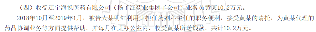 根據(jù)判決書,201810月至20191月,被告人某明紅利用其擔任藥劑科主任的職務(wù)便利,接受遼寧海悅醫(yī)藥有限公司(揚子江藥業(yè)集團子公司)業(yè)務(wù)員黃某的請托,為黃某代理的藥品協(xié)調(diào)業(yè)務(wù)等方面提供幫助,并每月在其辦公室內(nèi),收受黃某所送錢款,共計10.2萬元。