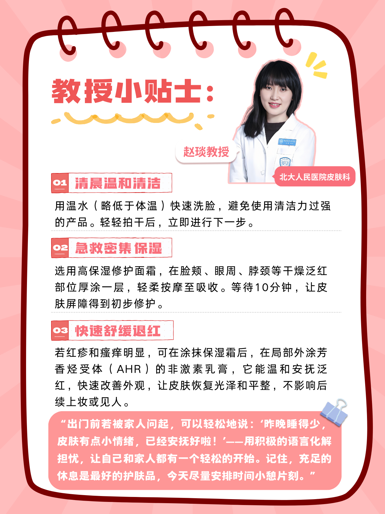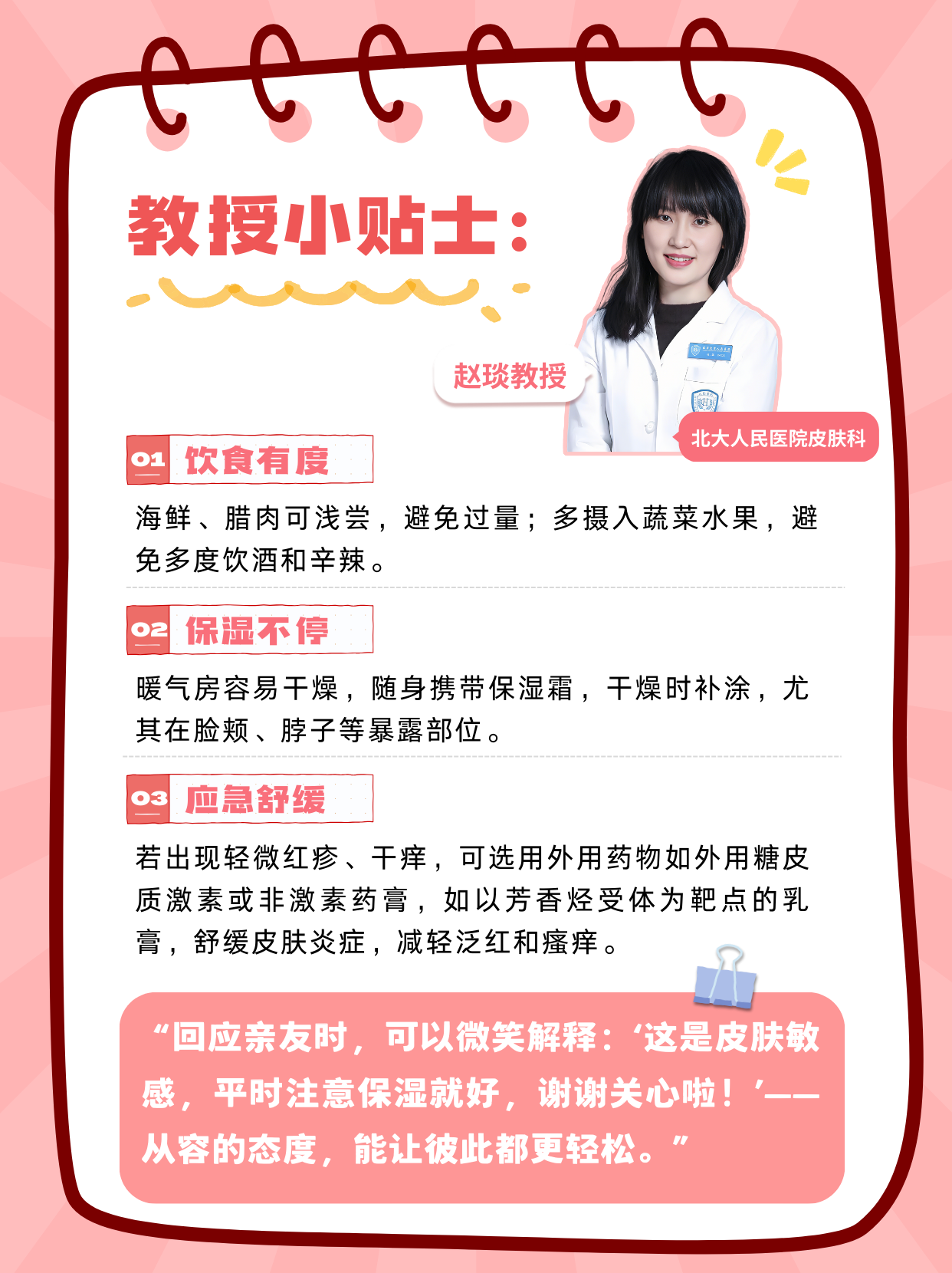 “回應(yīng)親友時,可以微笑解釋:‘這是皮膚敏感,平時注意保濕就好,謝謝關(guān)心啦!’——從容的態(tài)度,能讓彼此都更輕松?!?/p>