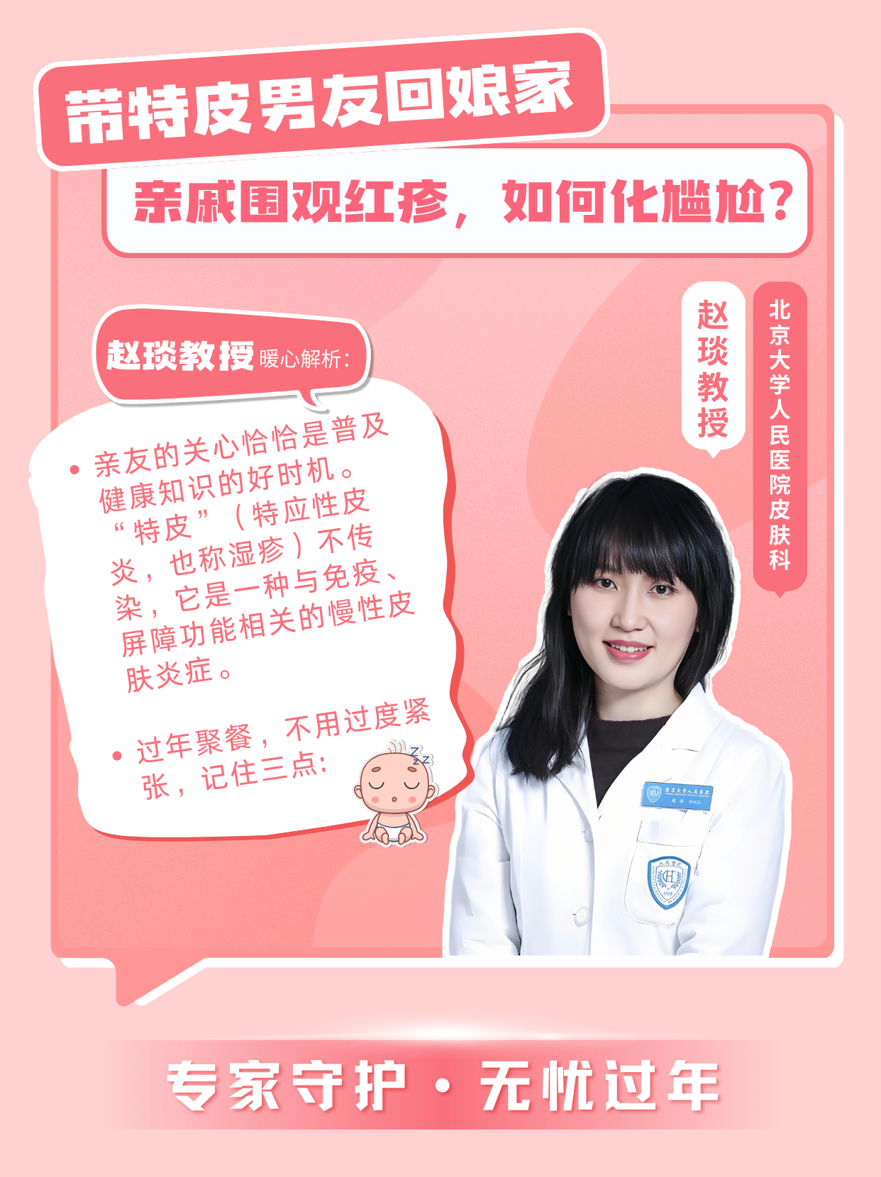 “親友的誤解恰恰是普及健康知識的好時機(jī)?!仄ぁㄌ貞?yīng)性皮炎,也稱濕疹)不傳染,它是一種與免疫、屏障功能相關(guān)的慢性皮膚炎癥。過年聚餐,不用過度緊張,記住三點: