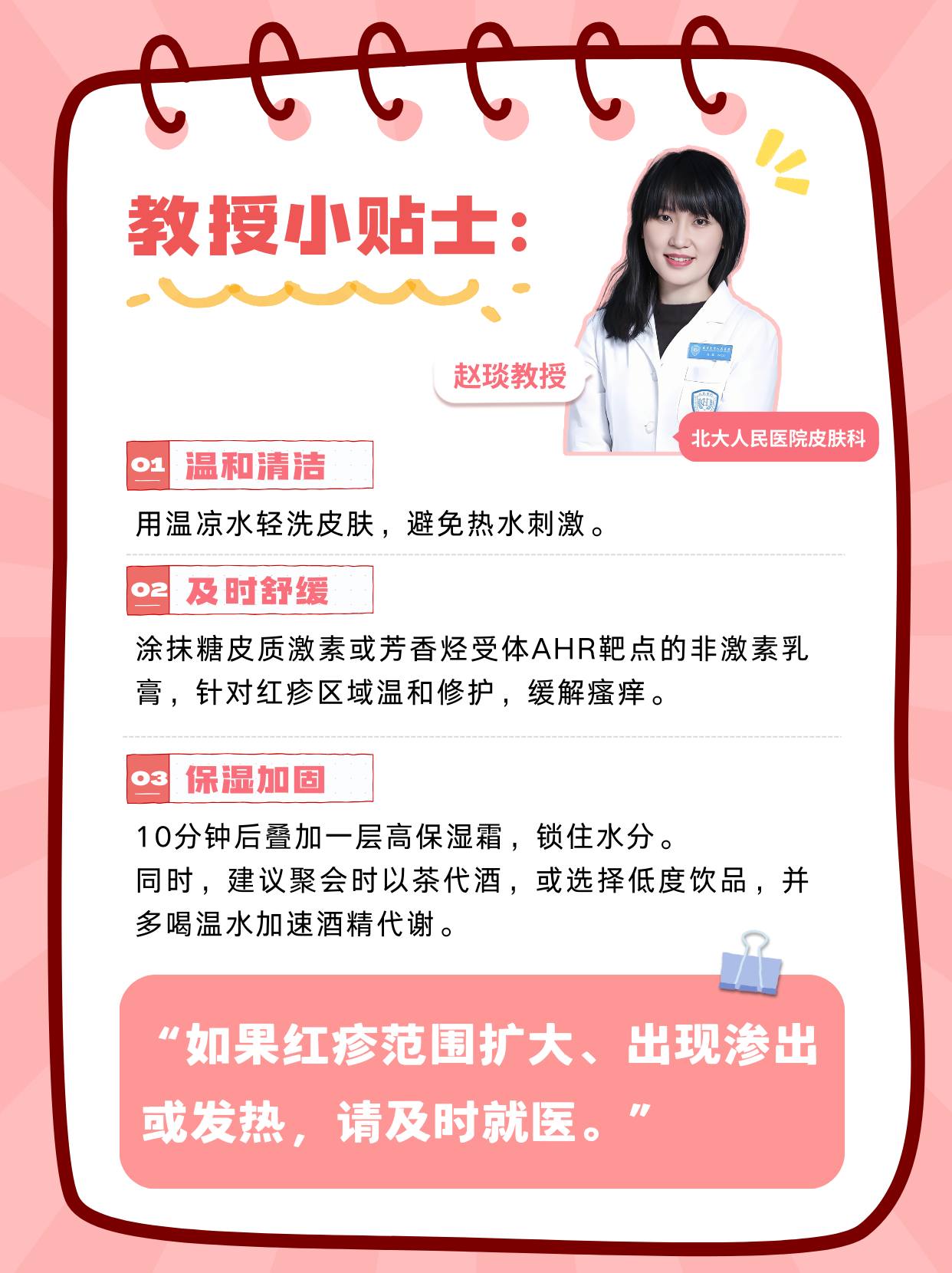 “如果紅疹范圍擴(kuò)大、出現(xiàn)滲出或發(fā)熱,請及時就醫(yī)?!?/p>