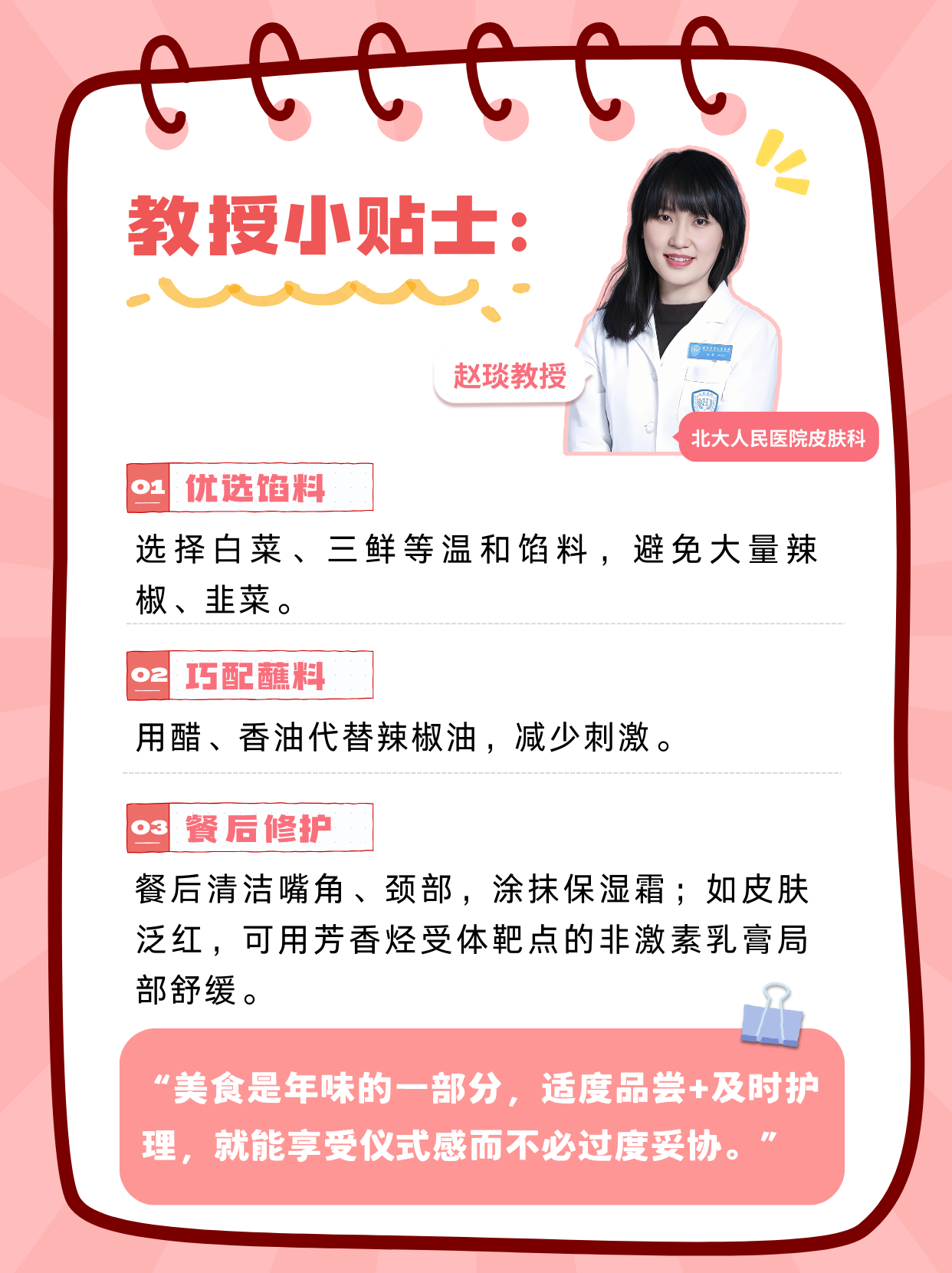 “節(jié)日美食當(dāng)前卻要克制,確實需要很大的心理能量。特應(yīng)性皮炎患者的皮膚屏障較脆弱,辛辣刺激、部分海鮮或發(fā)酵食物可能誘發(fā)或加重炎癥反應(yīng)。但‘迎財神’的團(tuán)圓時刻,完全不必把自己隔離在美食之外。”可以: