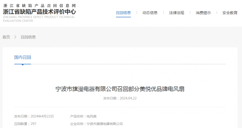 寧波市旗漫電器有限公司召回部分美悅優(yōu)品牌電風(fēng)扇