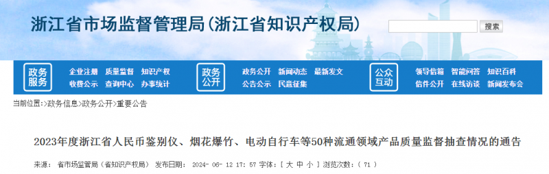 2024年6月12日,浙江省市場(chǎng)監(jiān)督管理局網(wǎng)站發(fā)布2023年度浙江省人民幣鑒別儀、煙花爆竹、電風(fēng)扇、電動(dòng)自行車(chē)等50種流通領(lǐng)域產(chǎn)品質(zhì)量監(jiān)督抽查情況的通告。